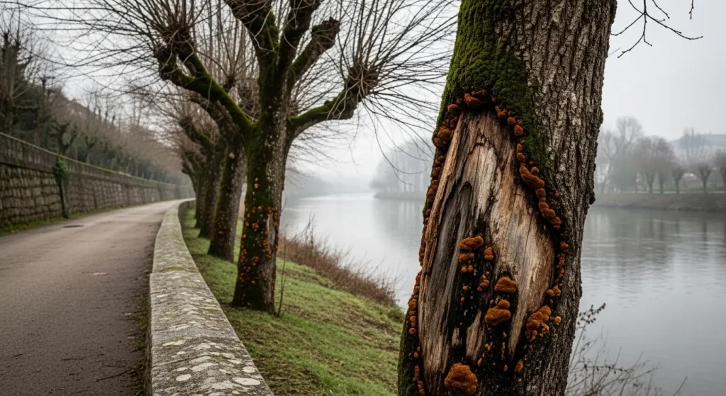 El agente patógeno actúa desde el interior de la planta; penetra por heridas o por las lenticelas de la corteza y termina taponando el xilema, lo que impide el transporte de agua y acelera el secado del árbol. No es una novedad reciente: la afección se detectó en la cuenca del Miño-Sil en 2009 y desde entonces ha sido objeto de seguimiento por parte de la Confederación Hidrográfica, cuyo servicio de conservación mantiene inspecciones periódicas en distintos tramos del río.