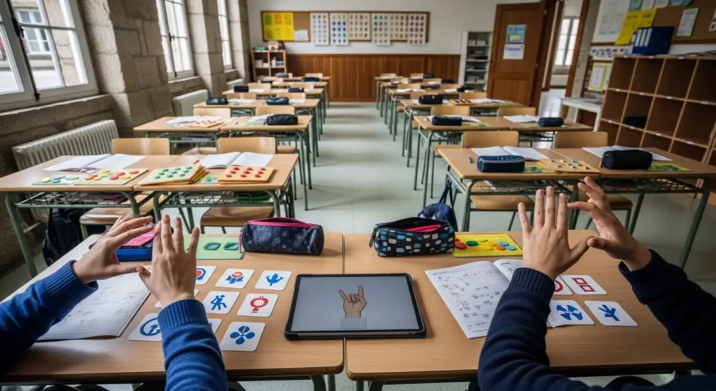 Los cambios son visibles a simple vista: pictogramas que acompañan al calendario del aula, el abecedario dactilológico instalado en la puerta, y en cada pupitre una pequeña referencia que muestra el signo manual asociado al nombre del alumno. Las buenas tardes y los saludos, antes verbales y discretos, se han incorporado como un ritual que todos comparten utilizando gestos básicos en lengua de signos. Esos gestos han modificado no solo la manera de saludar, sino también las relaciones cotidianas entre compañeros.